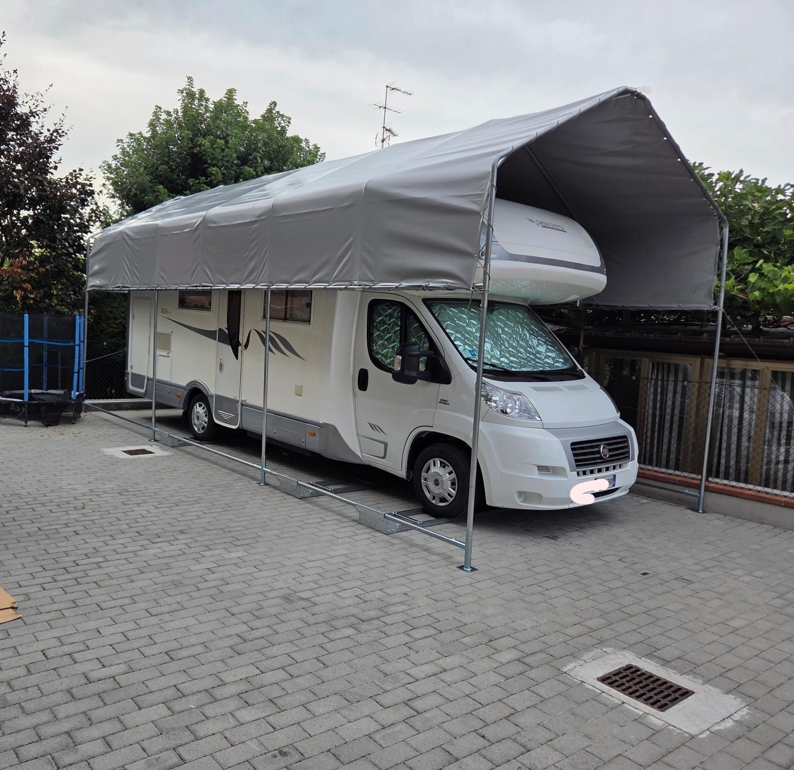 Chiusura Testata Anteriore: Per ragioni tecniche legate alle dimensioni della struttura, non è possibile effettuare una chiusura totale dell’ingresso. In alternativa, su richiesta, forniamo un pannello in PVC progettato per una chiusura parziale.